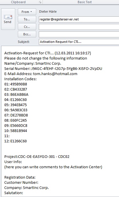After filling out the screen, select: Request Unlock Key by E-Mail - send E-Mail. This will open your default E-Mail client. An e-mail with the hardware IDs and licence information will be created. Press send to send the e-mail to our activation center. You will get an Unlock Key back within 2-3 business days.