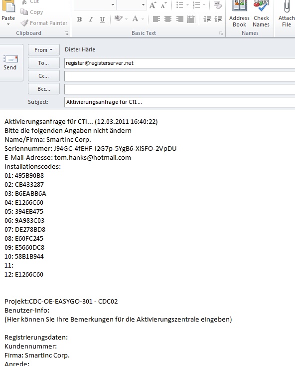 Ihr Standard E-Mail Programm wird geöffnet und ein E-Mail mit Ihren Hardwaredaten und Lizenzinformationen erstellt.