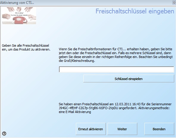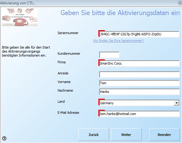 Die E-Mail Aktivierung benötigt die Seriennummer, Firma, Name, Land und Ihre E-Mail Adresse.