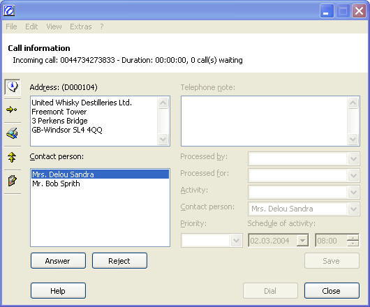 | • | Contact person: A selection of the contact persons associated with the address or only one contact person, if the phone number could be linked directly to that contact person. If supported by the database, the form of address and title will be displayed, otherwise only the first and last name. If you select a contact person, his/her name is used as contact information for the telephone note / follow-up. |