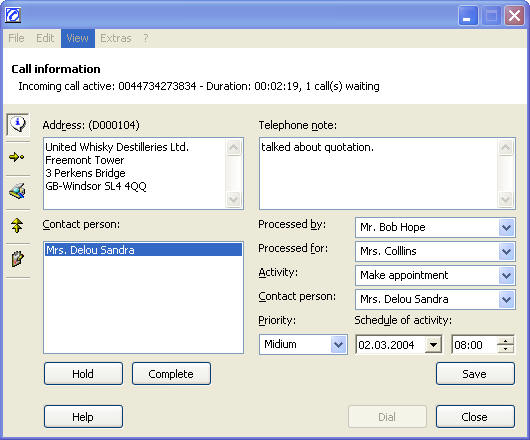| • | Telephone note: A free text which is stored for the phone call in your database |