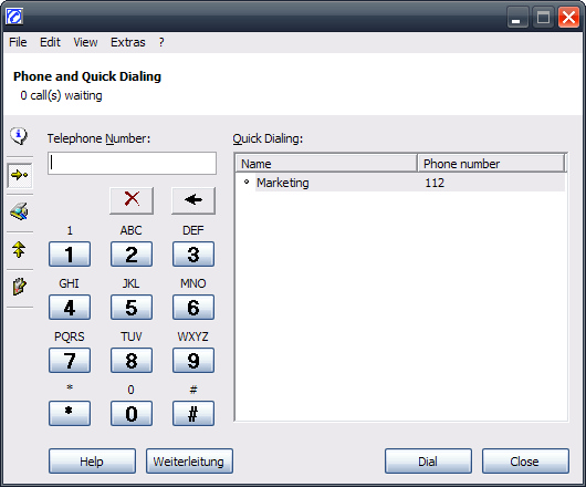 Additionally, you can store any numbers for quick (speed) dialing specifying a name and phone number. By clicking on an entry or pressing the button DIAL the number will be dialled. You can add, rename, edit, delete an entry with the menu Edit -> Quick dialing or with a right mouse button click.