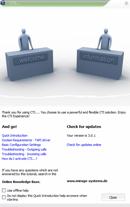 The screen can be deactivated by checking Do not display this Quick Introduction help anymore when starting and activated again in the Configuration Wizard, Display Quick Introduction Help.