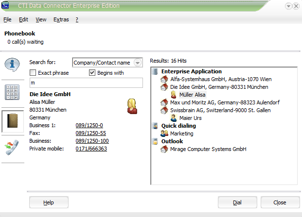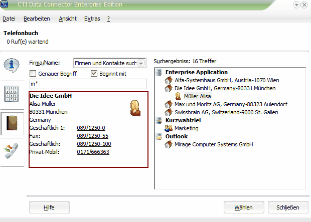 The search is done in all databases configured for your system, the quick dialing list and in the contact folders of Microsoft Outlook™ .