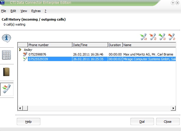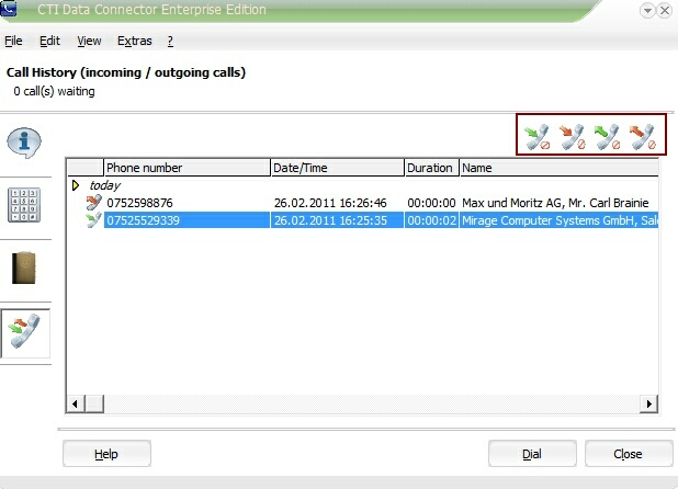 A selected entry in the list is picked for dialing by a double click or by clicking on the button Dial.