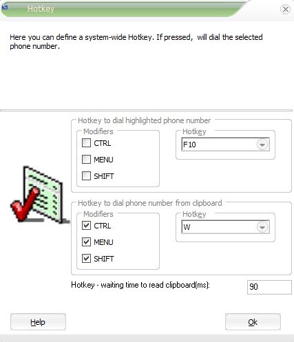 This Hotkey allows to dial a phone number which is stored in the clipboard. For details see Dial with the Clipboard. The default value is CTRL + MENU + SHIFT + W to make sure that other programs are not affected. If you use this functionality change the default to a value which: