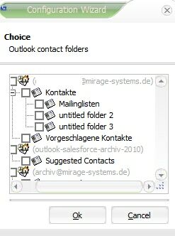 If there are remote Exchange folders, it may take up to a few minutes until the screen to select the folders will appear. If possible, select the option: Show only default contact folder