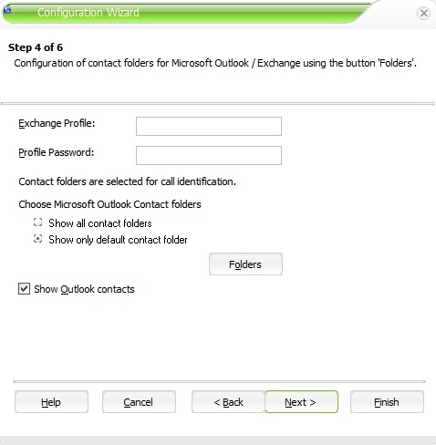 Here you can configure CTI Connector for using Microsoft Outlook™ for caller identification. This works both with a local Outlook database and with Exchange databases. The configuration refers the Outlook contact folder. As Outlook can use only one (Exchange) profile at a time, you can additionally specify the Exchange profile name and the password. Otherwise the profile used last will be applied.