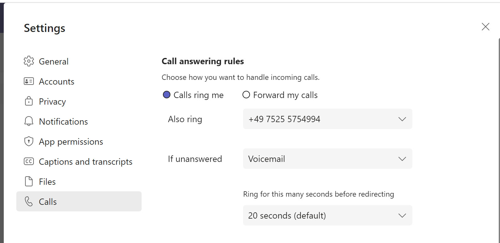 2.In der Teams App → Calls Tab → More Settings: Klingeleinstellungen so anpassen, dass Anrufe an die Bot-Nummer weitergeleitet werden.