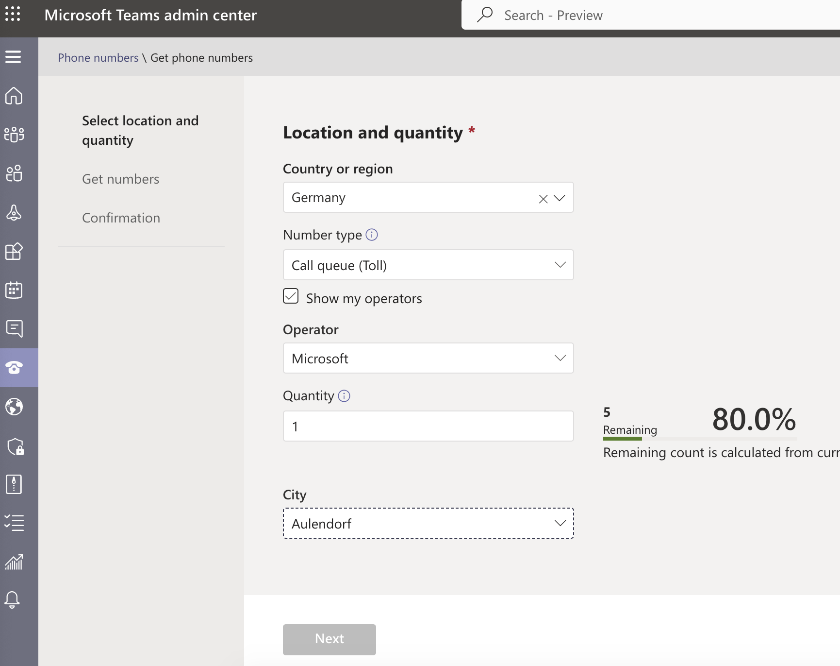 •Erforderliche Angaben ausfüllen und Call Queue Toll als Nummerntyp auswählen