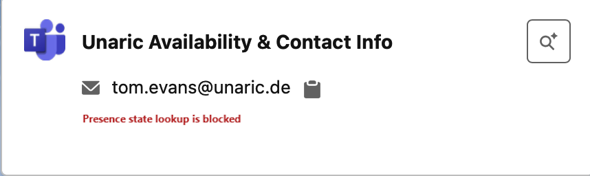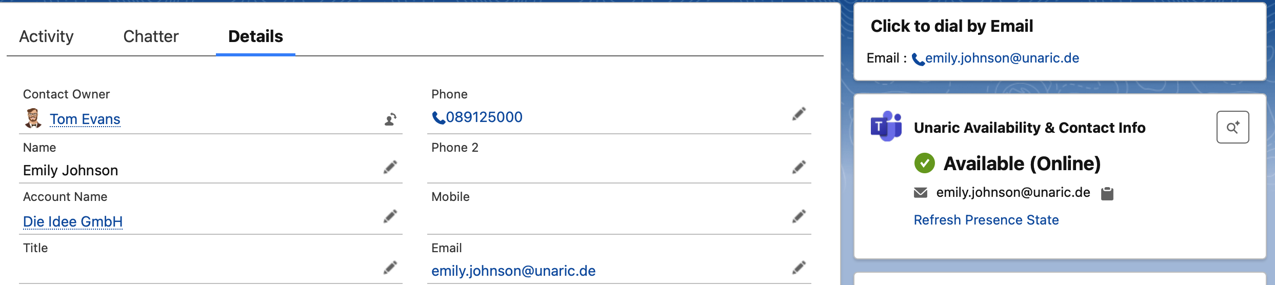 The Lightning Component Unaric Availability & Contact Info displays the Office 365 presence status of a Contact or Lead and their Office 365 email address.