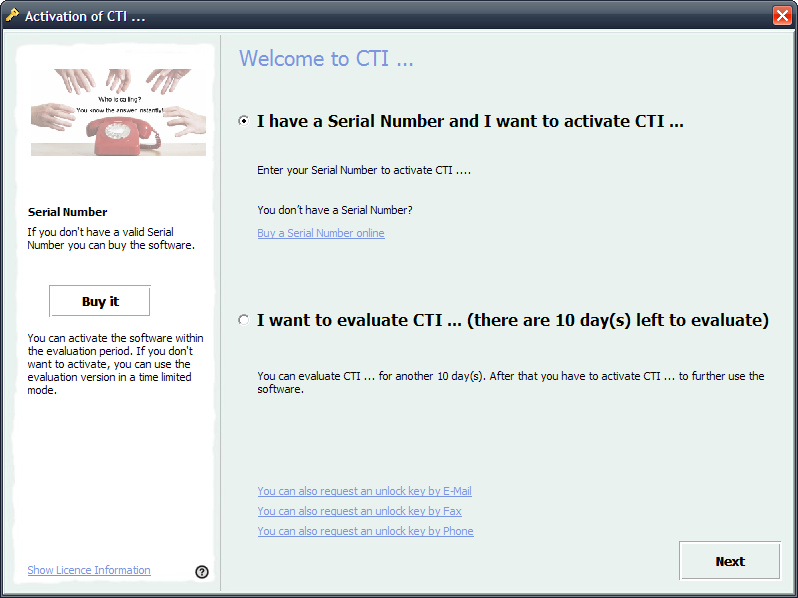 | • | I have a Serial Number and I want to activate CTI Data Connector Enterprise Edition. This will trigger the Online Activation. This is the recommended activation method and should be used if an Internet connection is available |