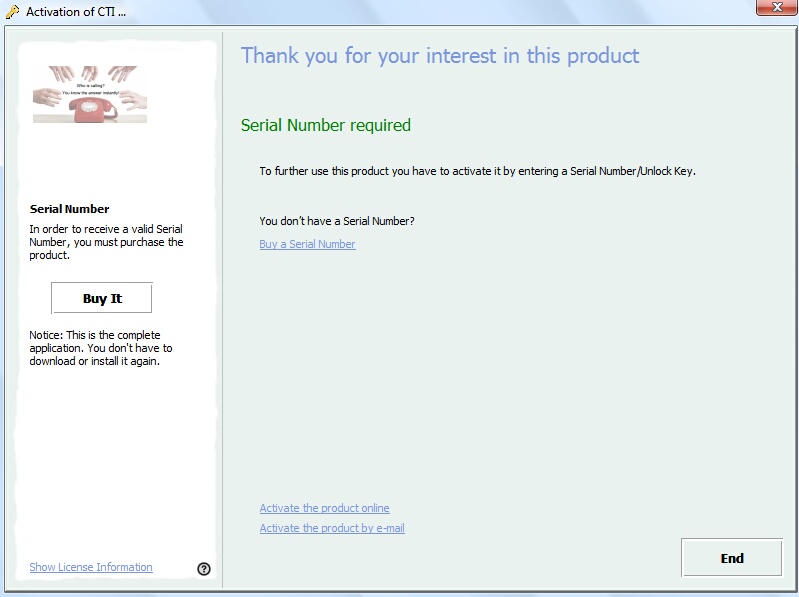 During the trial period, the activation screen appears with each start of the program. You need a Serial Number for activating the product - see Buy Serial Number.
