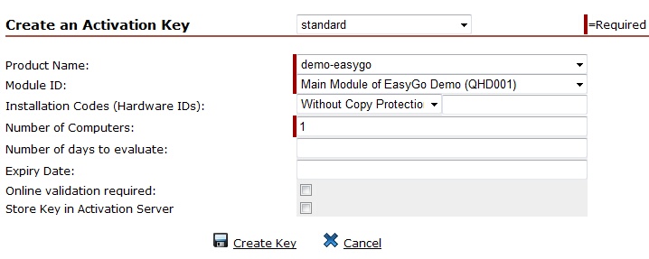 If you expect, that the user does not have an Internet connect, you can add the 8 digit hardware ID, which was used for copy protection. If the user has an Internet connection, select the option: Online validation required to ensure, that the key cannot be used multiple times.