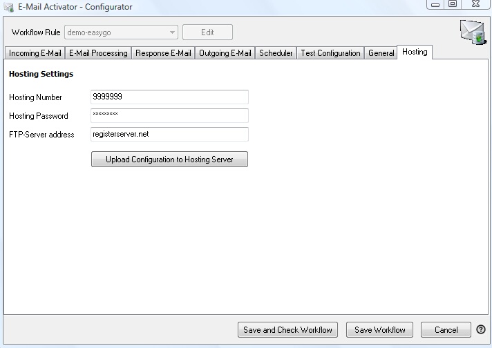 After making all the changes, press the button Upload Configuration to Hosting Server. This will send the configuration settings to the Activation Server.