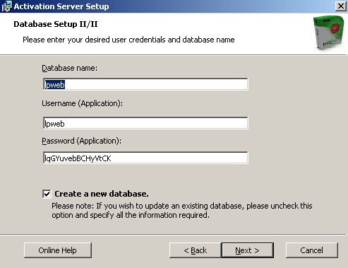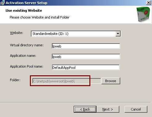 If you want to replace/update an existing Activation Server, the Virtual directory name must match the name you use in your application. A backup from the selected folder is generated and the SQL login data is automatically retrieved (see next page - Configure SQL Server).