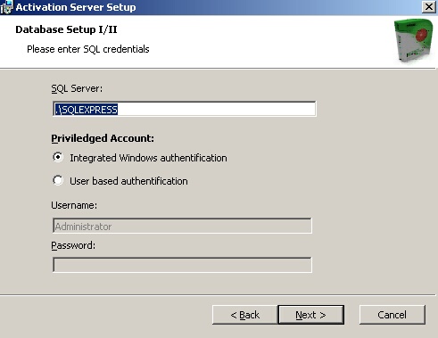 Type in the SQL Servername\instance. If you use SQL Server Express Edition, the default server name is .\SQLEXPRESS. To create the database for the Activation Server server, the installer need the login data and administrator rights for the database. Either specify Integrated Windows authentication or specify an existing SQL server user with admin rights. These credentials are used only to create the database and add users.