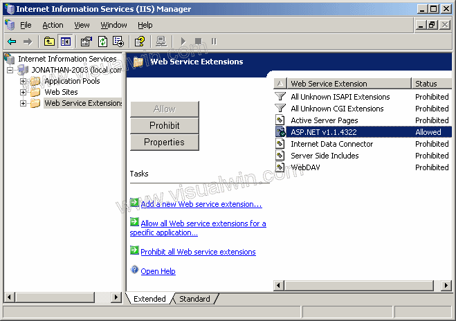 If you get an error that a page can not be loaded then Start IIS. Expand your computer name and click on "Web Service Extensions". Make sure "ASP.NET" has a checkmark next to it, and that means that it's enabled.