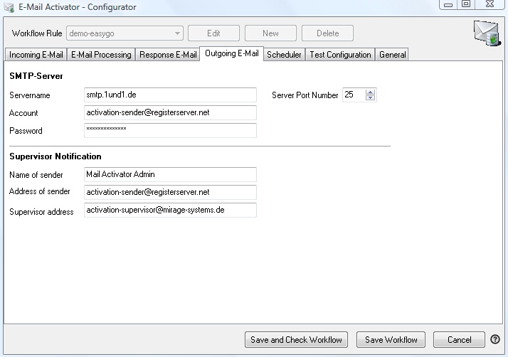 | • | Address of sender. This is the E-Mail address the supervisor will see as sender E-Mail address in the E-Mail - e.g. activation-service@registerserver.net |