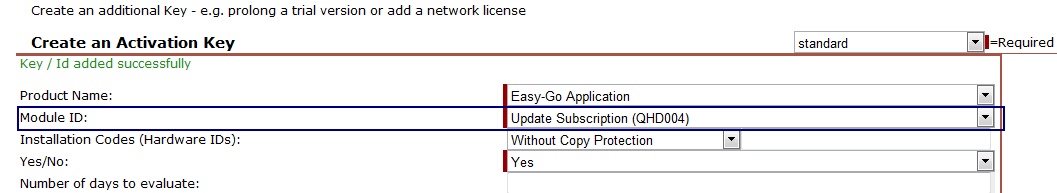 If you want to create Activation Keys, using the Web Administration Interface, you have to add a product definition for every module you want to create a key.