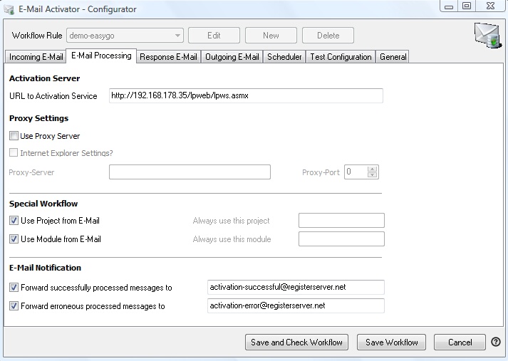 | • | Forward erroneous process messages to - sends a copy of the E-Mail, where an activation failed (e.g. because the Serial Number / ID) was already used, to the specified E-Mail address |