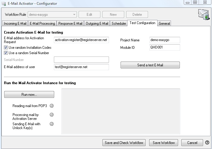 Now you can run a test which processes all E-Mails, stored in the mailbox for Incoming E-Mail. If you have sent a Test E-Mail, then at least one Activation would be processed. Press the button Run Now. The following workflow is processed:
