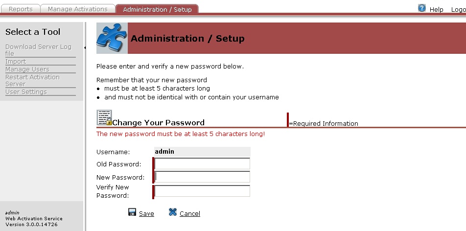 The old password is empty and the new password must be at least 5 characters long. Press Save after you have filled out the form.