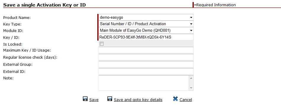This page allows you to save an Activation Key or ID which was created using the Licence Generator. This is necessary if default parameters like Maximum Usage should be set to a special value for the specified Activation Key or ID before it is used. You can also lock a key / ID if it was not already used.