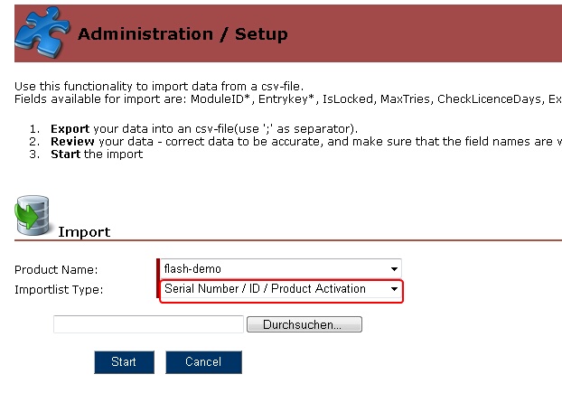 To import a list of Serial Numbers / IDs, you need a valid CSV file (separator = ;) with Serial Numbers and as a column heading Module ID and Entrykey. You can additionally import a status for each key: IsLocked, MaxTries (= Maximum Key / ID Usage), CheckLicenceDays, ExternalGroup and ExternalID. ExternalGroup and ExternalID are reference fields for your internal use, e.g. to map the record to a CRM system.