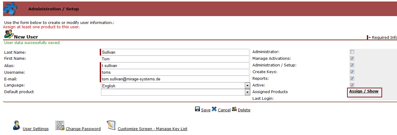 Only a user, which is an administrator, has access to all products. For all other users you have to select the products they can access. Click on Assign / Show to select products. Select one or more products.