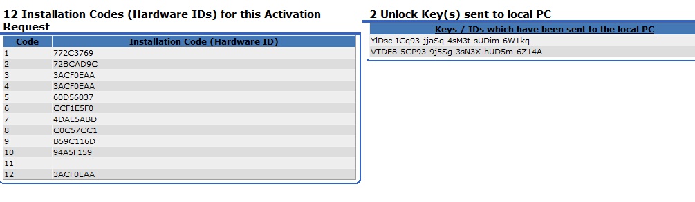 | • | Installation Codes (Hardware IDs) for this Activation Request – all installation codes received from the user machine are listed here. The number of the installation codes depend on the version of 16:55. |