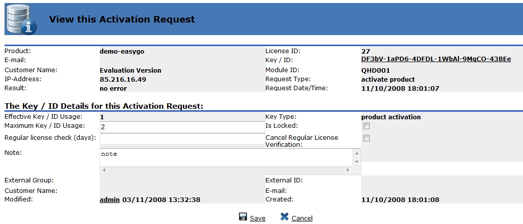 To modify an Activation Request click on Key / ID in the list view of Activation Requests.
