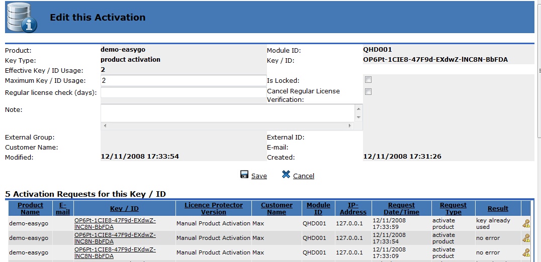 This view gives you an overview of all Activation Requests for one single Serial Number / ID / Activation Key.