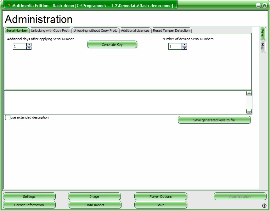 Supports administration tasks like creating keys (Serial Number, Unlock Key, Licence Keys) or access to administrations issues like checking for the latest update, Web Activation Server administration interface and version information.