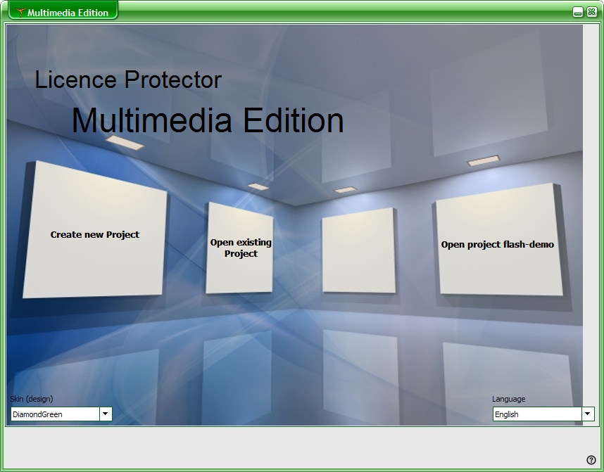 After starting Licence Protector Multimedia Edition the main start screen appears. You can select a Skin and a Language to customize Licence Protector Multimedia Edition.