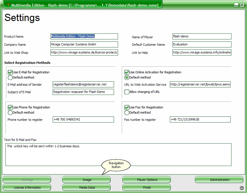 In the lower pane window the navigation buttons can be found. They allow to select a category like Settings or Licence Information and provide access to the online help.