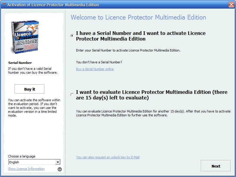 | • | I have a Serial Number and I want to activate Licence Protector Multimedia Edition. This will use the Online Activation. This is the recommended activation method and should be used if an Internet connection is available |