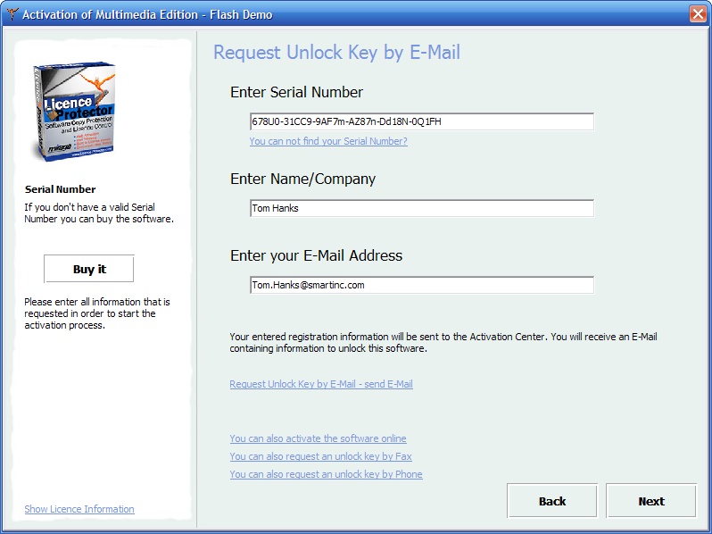 The E-Mail Activation needs the Serial Number, company name and e-mail address. After filling out the screen, an e-mail with the hardware IDs and licence information is generated. You have to send one key back to the customer to activate the copy protection (see screen Enter Unlock Key). Details of the workflow.