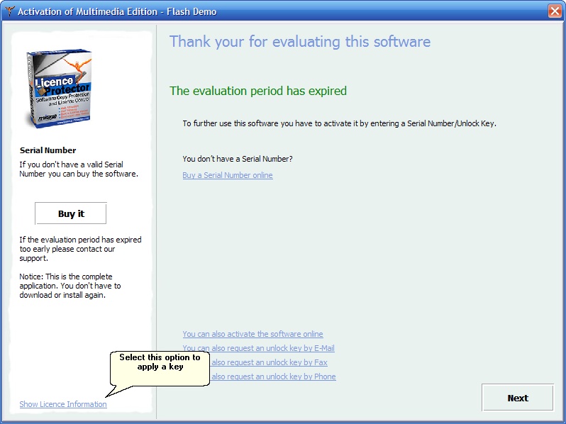If the evaluation period has expired, select Show Licence Information (see screen below) and then press the button Activation Key.