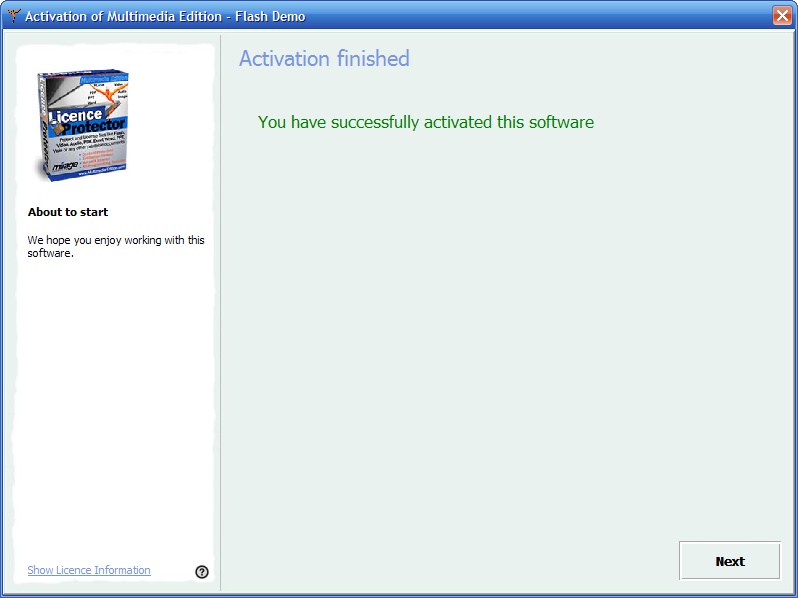After Online Activation or successfully entering an Unlock key, this screen appears to indicate that the activation process is finished. The next start of the Multimedia Player will display a screen only in case of an error.