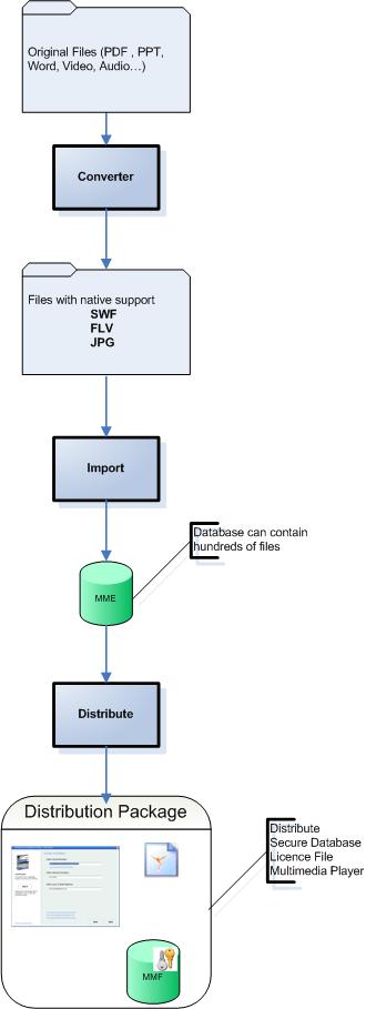 You can select files to import from one folder and all its subfolders. The start file has to be a .SWF , .FLV , .EXE or PDF file. This file can address any other file types like video or audio which are supported within flash. All selected files are imported into the project file and are stored in an encrypted format.
