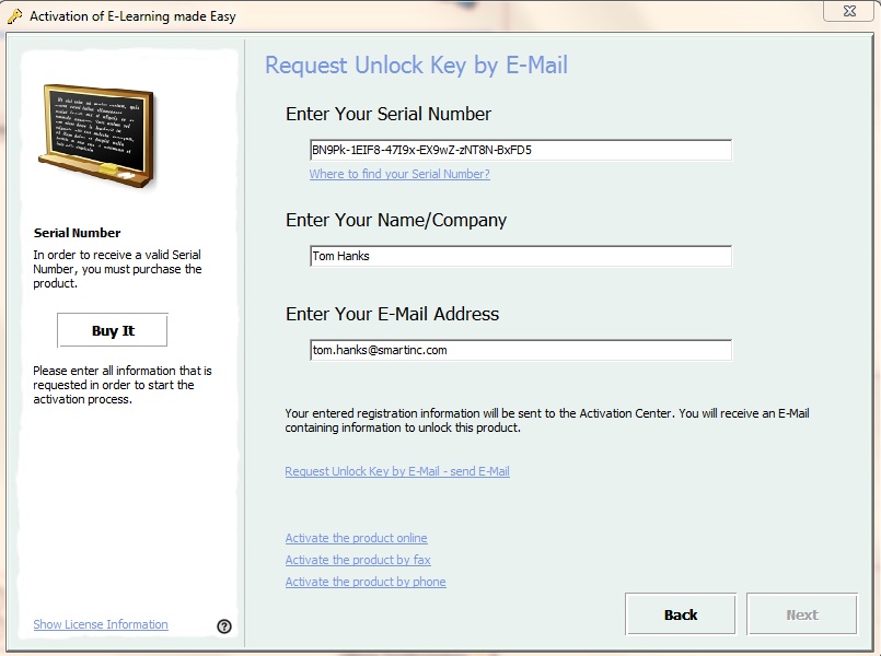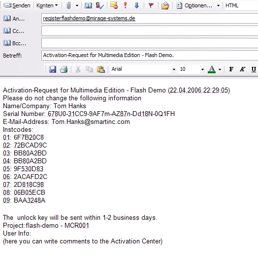 The E-Mail Activation requires the Serial Number, company name and e-mail address. After filling out the screen, an e-mail with the hardware IDs and license information will be generated. You have to send one key back to the customer to activate the copy protection (see screen Enter Unlock Key). Details of the workflow.