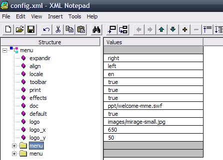 The structure of the menu is defined with the file config.xml. It can be modified using any editor. If you do not have an XML Editor see How to edit an XML file. The name of the menu application is advanced-menu.swf.
