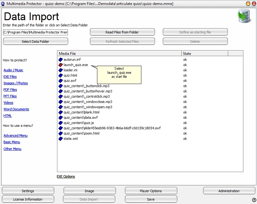Now import all the files from the project folder and mark launch_quiz.exe as startfile using the button Define as starting file. A red icon signals the start file.