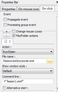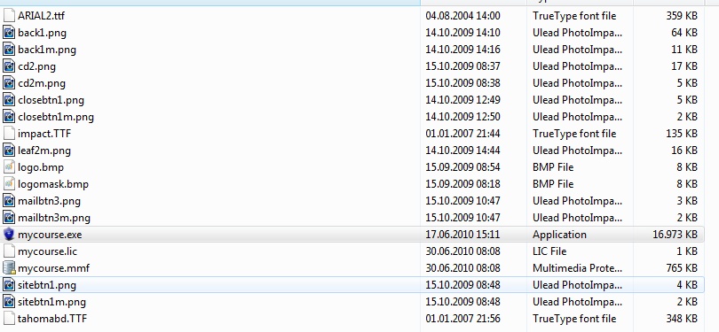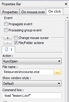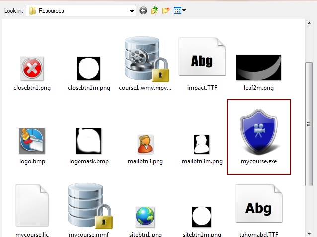 In the screenshot below, the file (Player) mycourse.exe is started and loads the file lesson1.swf.