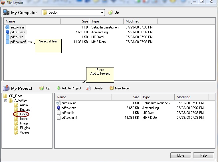 You have to add all files which should be included in the Autorun MAX! project. Select the menu Project, File Layout. In the upper part of the screen open the Deploy folder, select all files and add the files to the docs folder.