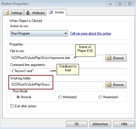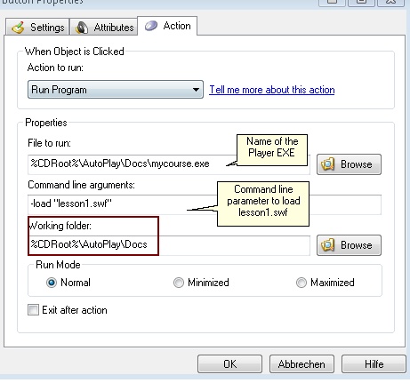 In the screenshot below, the file (Player) mycourse.exe is started and loads the file lesson1.swf. You have to set the Working folder to the same path where the Multimedia Player.exe is located.