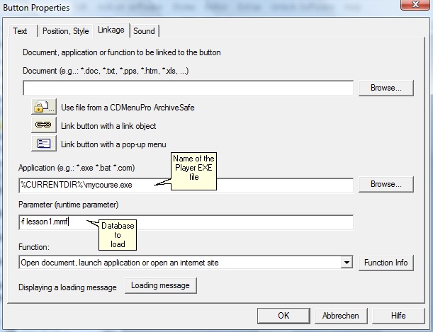 In the line Parameter add the command to load a flash file or PDF file. See chapter Start a specific file inside the database to get all details for this command.