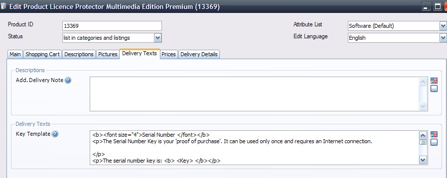 Start the cleverbridge Commerce Assistant. Edit a product and add a delivery text. This text will include the Activation Key which will be generated after the order process and is used in the e-mail which is send out to the customer. The delivery text can be in HTML format.