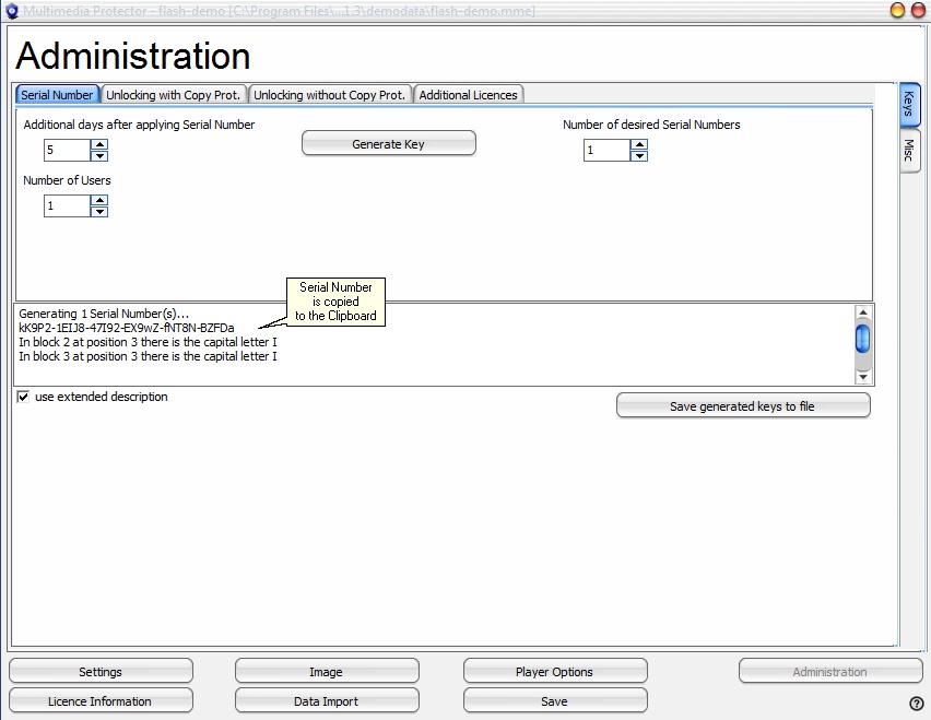 After pressing the button Generate Key, the key(s) including the extended description is/are copied into the text box. If only one key is generated, it is also copied into the clipboard.